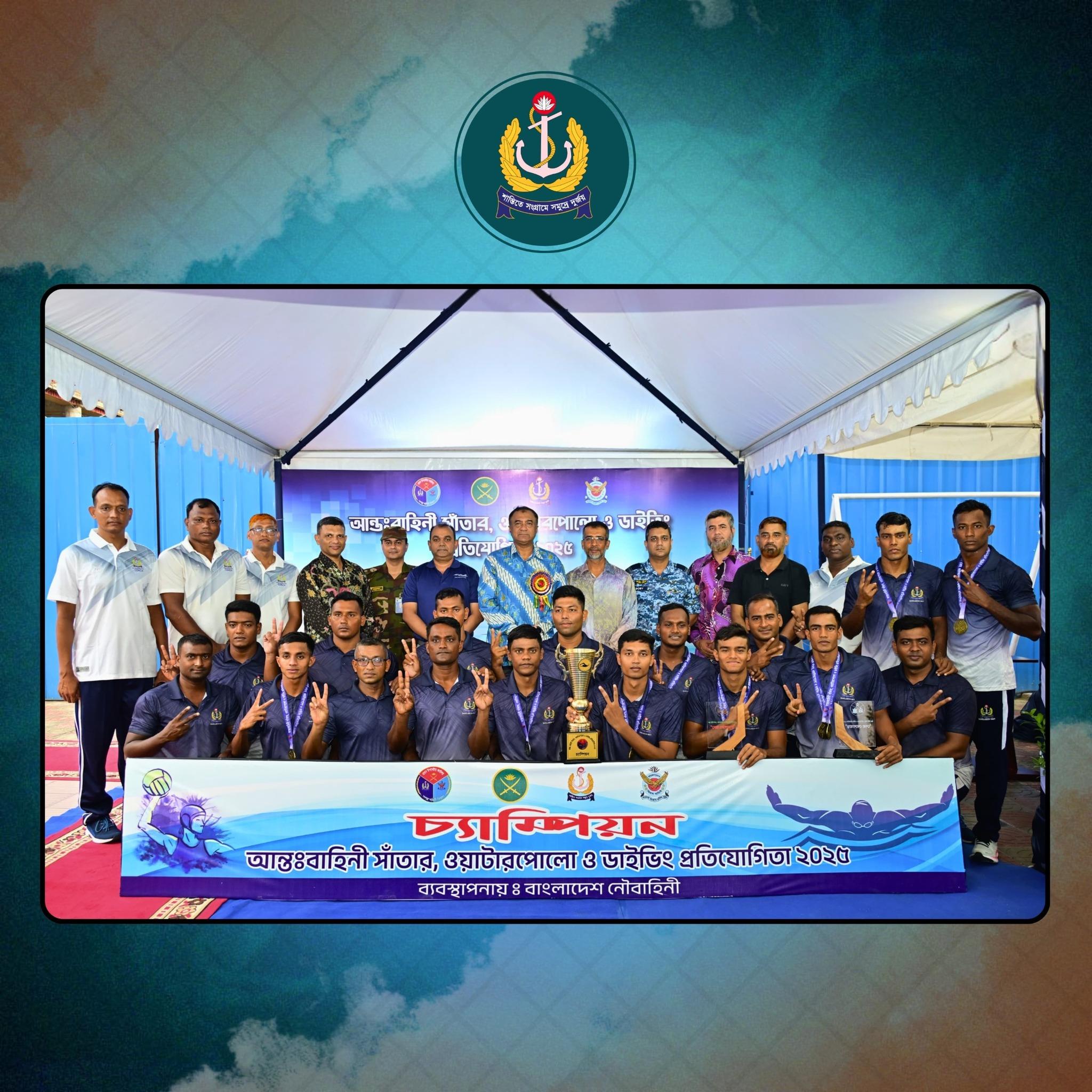 See Moreগত ১৪ই সেপ্টেম্বর হতে শুরু হওয়া আন্তঃবাহিনী সাঁতার, ওয়াটারপোলো ও ডাইভিং প্রতিযোগিতা ২০২৫ এ চ্যাম্পিয়ন হওয়ার গৌরব অর্জন করে বাংলাদেশ নৌবাহিনী।