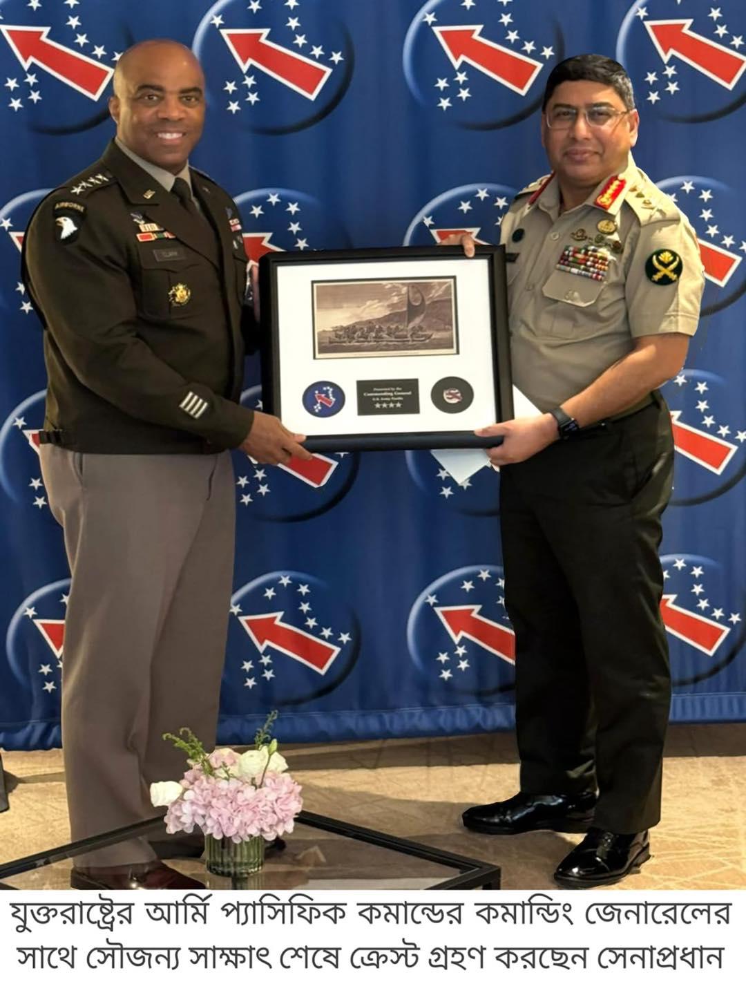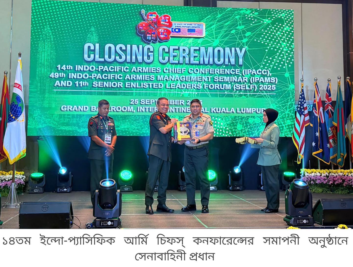 মালয়েশিয়ায় অনুষ্ঠিত ১৪তম ইন্দো-প্যাসিফিক আর্মি চিফস্ কনফারেন্স শেষে দেশে ফিরলেন সেনাবাহিনী প্রধান ঢাকা, ২৭ সেপ্টেম্বর ২০২৫ (শনিবার): মালয়েশিয়ায় অনুষ্ঠিত ইন্দো-প্যাসিফিক আর্মি চিফস্ কনফারেন্সে (IPACC) অংশগ্রহণ শেষে গত রাতে সেনাবাহিনী প্রধান জেনারেল ওয়াকার-উজ-জামান, এসবিপি, ওএসপি, এসজিপি, পিএসসি দেশে প্রত্যাবর্তন করেছেন। গত ২৩-২৬ সেপ্টেম্বর পর্যন্ত অনুষ্ঠিত এ সম্মেলনে ইন্দো-প্যাসিফিক অঞ্চলের সেনাপ্রধানগণ মৈত্রী ও সহযোগিতা জোরদার, অভিন্ন চ্যালেঞ্জসমূহ মোকাবেলায় মতবিনিময় এবং আঞ্চলিক সংকটে সমন্বিত পদক্ষেপ গ্রহণের বিষয়ে আলোচনা করেন। এ সম্মেলনে সেনাবাহিনী প্রধান ইন্দো-প্যাসিফিক অঞ্চলের বহুমাত্রিক চ্যালেঞ্জ মোকাবিলায় প্রতিযোগিতার পরিবর্তে অংশীদারিত্ব ও সহযোগিতার উপর গুরুত্বারোপ করেন। পাশাপাশি তিনি মানবিক দৃষ্টিভঙ্গি, পেশাদারিত্ব ও গঠনমূলক সম্পৃক্ততার মাধ্যমে আঞ্চলিক শান্তি ও স্থিতিশীলতায় বাংলাদেশ সেনাবাহিনীর অঙ্গীকার পুনর্ব্যক্ত করেন। সফরকালে সেনাবাহিনী প্রধান যুক্তরাষ্ট্রের আর্মি প্যাসিফিক কমান্ডের কমান্ডিং জেনারেল General Ronald Patrick Clark এবং মালয়েশিয়ার সেনাবাহিনী প্রধান General Tan Sri Dato' Sri Muhammad Hafizuddeain Jantan এর সাথে পৃথকভাবে সৌজন্য সাক্ষাৎ করেন। সাক্ষাৎকালে তিনি বাংলাদেশ সেনাবাহিনীর আধুনিকায়ন ও সক্ষমতা বৃদ্ধি, পেশাগত উন্নয়ন ও প্রশিক্ষণ, প্রতিরক্ষা উৎপাদনে প্রযুক্তি হস্তান্তর, রোহিঙ্গা প্রত্যাবাসন, আঞ্চলিক ও বৈশ্বিক নিরাপত্তা বিষয়ক পারস্পরিক সহযোগিতা এবং যৌথ প্রশিক্ষণসহ বিভিন্ন বিষয়াদি আলোচনা করেন। উল্লেখ্য, গত ২২ সেপ্টেম্বর ২০২৫ তারিখে সেনাবাহিনী প্রধান সরকারি সফরে মালয়েশিয়া গমন করেন।